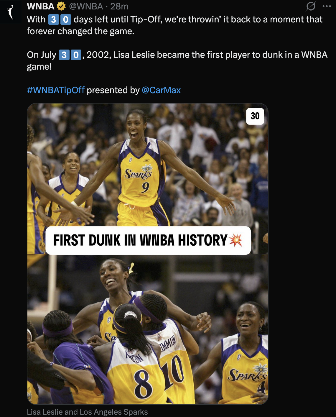 Lisa Leslie is an American former professional basketball player. She is the head coach for Triplets in the BIG3 professional basketball league, as well as a studio analyst for Orlando Magic broadcasts on Fox Sports Florida. Leslie played in the Women's National Basketball Association (WNBA). She is a three-time WNBA MVP and a four-time Olympic gold medal winner. The number-seven pick in the 1997 inaugural WNBA draft, she followed her career at the University of Southern California with eight WNBA All-Star selections and two WNBA championships over the course of eleven seasons with the Los Angeles Sparks, before retiring in 2009. Leslie was the first player to dunk in a WNBA game. In 2015, she was inducted into the Naismith Memorial Basketball Hall of Fame. Leslie was also inducted into the Women's Basketball Hall of Fame in 2015.